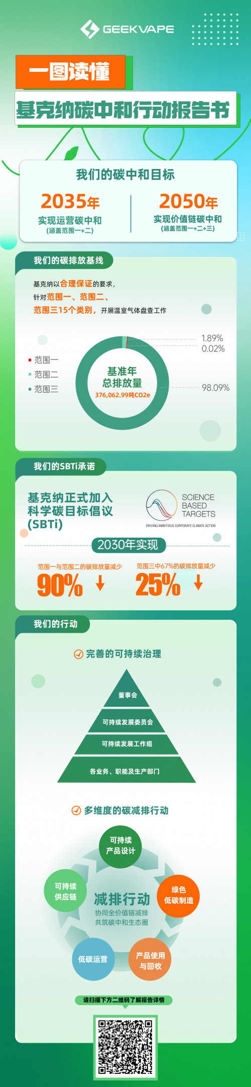 7月25日,基克納正式發布首份《基克納碳中和行動報告》(以下稱“《行動報告》”),承諾2035年實現運營碳中和,2050年實現全價值鏈碳中和的目標。此外,基克納已於6月20日正式加入了科學碳目標倡議(Science Based Targets initiative, SBTi),成為全球非上市電子霧化企業中第一家加入SBTi的企業。這展現了基克納積極應對全球氣候變化,響應國家“3060”雙碳戰略目標,及助力實現行業綠色低碳發展的決心。