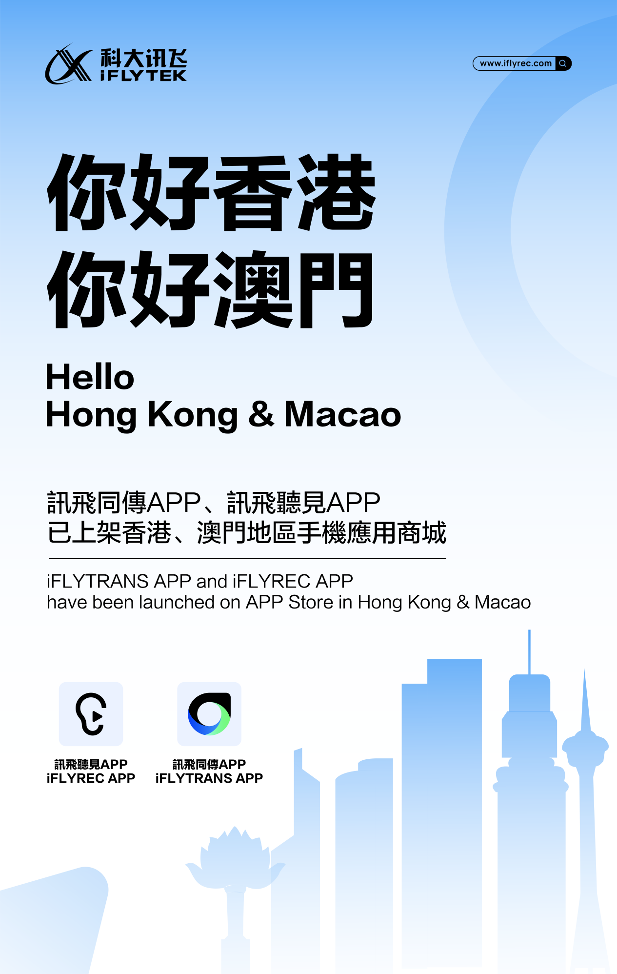 BEYOND活動前夕,訊飛同傳APP、訊飛聽見APP已在香港澳門地區上架手機應用商城,用戶可體驗高效AI同聲傳譯和AI語音轉寫服務。訊飛同傳APP目前支持中文和15種語言的同傳互譯。(訊飛同傳APP支持語種:中文、英語、日語、韓語、俄語、法語、西班牙語、阿拉伯語、德語、葡萄牙語、越南語、泰語、義大利語、粵、維、藏)