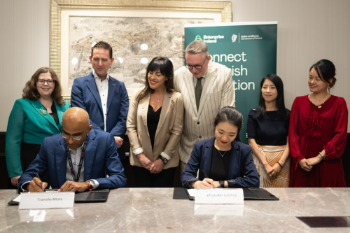 愛爾蘭國務部長(金融服務、信用社和保險)Jennifer Carroll MacNeill TD(左三)、TransferMate創辦人兼主席Terry Clune(左二)出席簽約儀式,見證XTransfer新加坡CEO蕭麗欣與TransferMate亞太區負責人Vijay Rao 的戰略合作簽署。