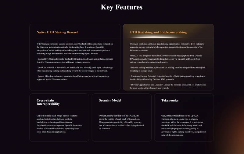 更值得一提的是,OpenZK不僅整合了Ethereum原生質押,還與多個知名的DeFi平臺合作,如Rocketpool和EigenLayer等。這些合作將幫助OpenZK進一步提升其L2質押收益,使得用戶能夠獲得ETH質押獎勵、EigenLayer代幣獎勵以及OpenZK未來代幣的空投。這種多重收益的模式不僅增強了OpenZK的競爭力,也吸引了更多投資者和用戶的參與。