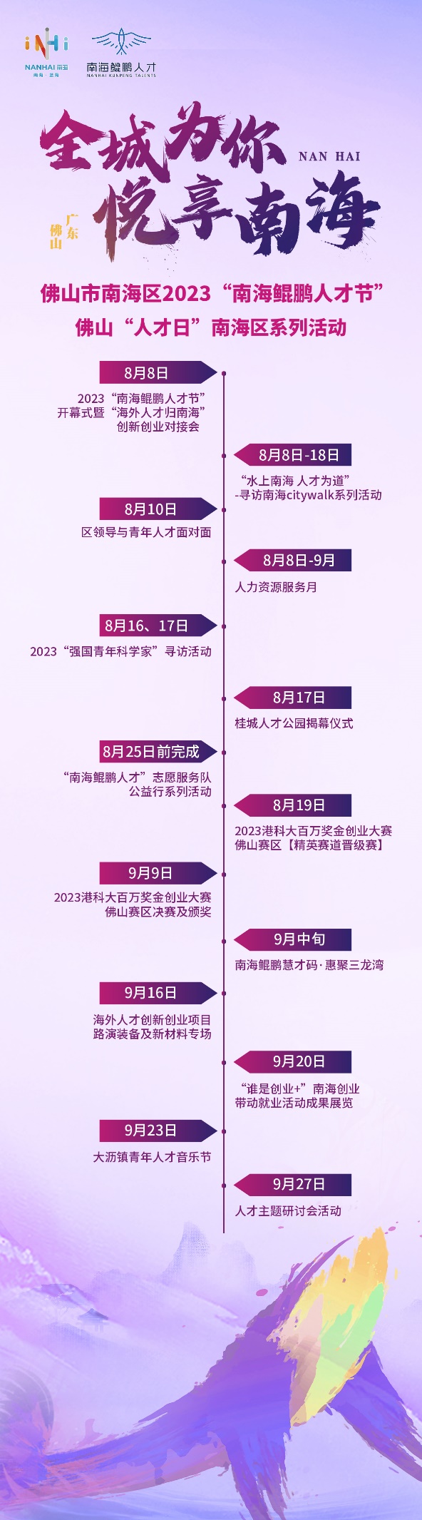 2023“南海鯤鵬人才節”延續了以往“風境潮匯”四大篇章的活動品牌,人才南海、文化南海、科創南海、青春南海元素豐富。 共計推出14項子活動,持續8、9兩個月。