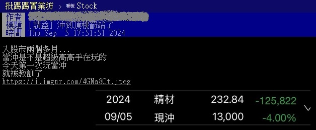 ▼原Po發文表示自己初次當沖就慘賠12萬,好奇是否有需要注意的技巧。(圖/翻攝自PTT)