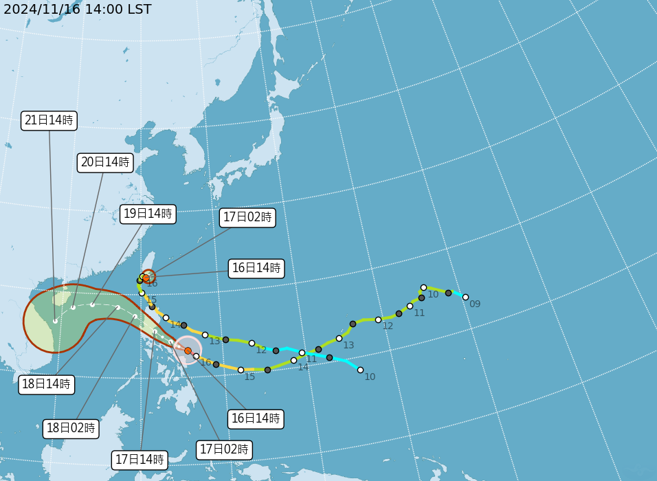 氣象署16日下午2點預估的萬宜颱風路徑。(圖/翻攝自氣象署官網)