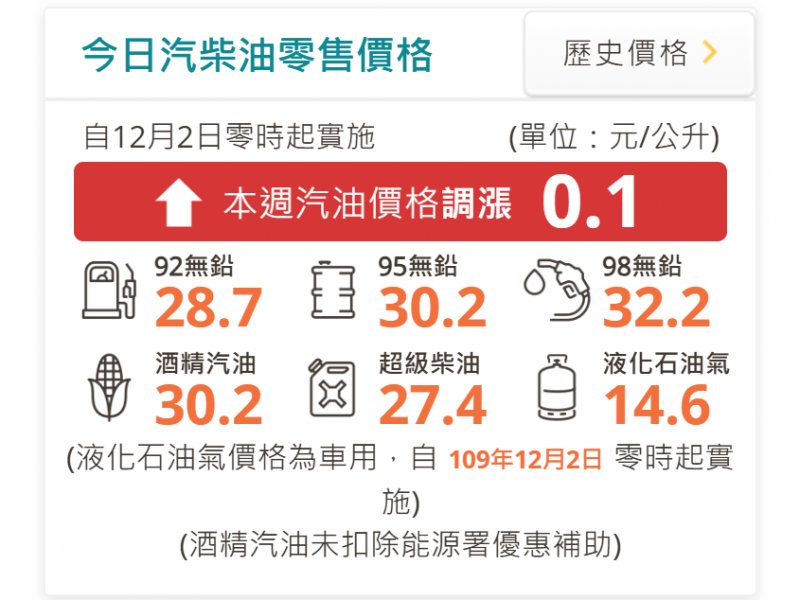 台灣中油表示,自明(2)日凌晨零時起汽、柴油各調漲0.1元及0.2元,參考零售價格分別為92無鉛汽油每公升28.7元、95無鉛汽油每公升30.2元、98無鉛汽油每公升32.2元、超級柴油每公升27.4元。本週因平穩雙機制啟動,汽、柴油各吸收0.9元。