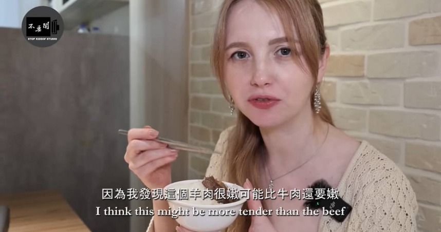 而對於羊肉爐的初次體驗,安娜先品嘗了店家的羊肉炒麵,直呼「而且沒我想像中的騷」。後續也吃了羊肉爐的肉塊,安娜也表示「羊肉很嫩,可能比牛肉還嫩」。