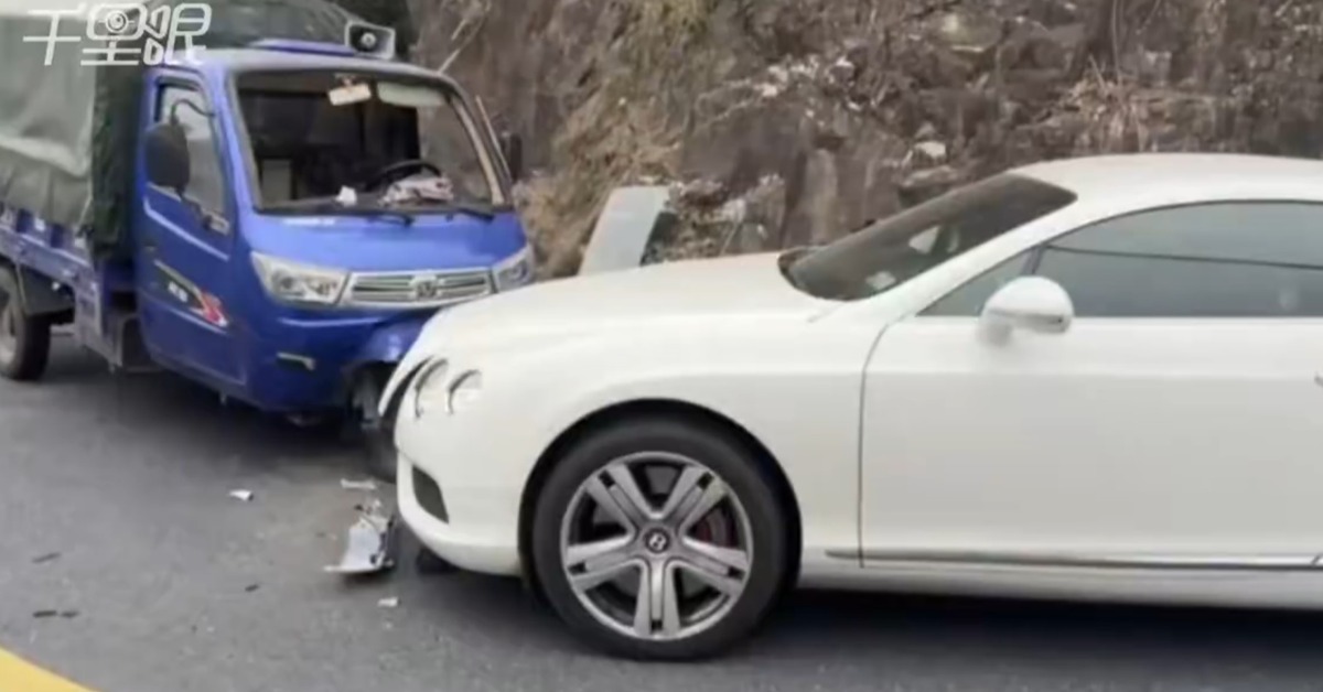 根據《大象新聞》、《極目新聞》報導,這起車禍發生在1月11日,一名賣豬肉的阿伯開著三輪車下山,但卻一路逆向,撞上了正常行駛的白色賓利車,根據事發畫面可以發現,事故發生後賓利轎車停在彎道內側,前保險桿掉了一塊下來,而三輪車的前輪扁了,而事故路段是單黃線。