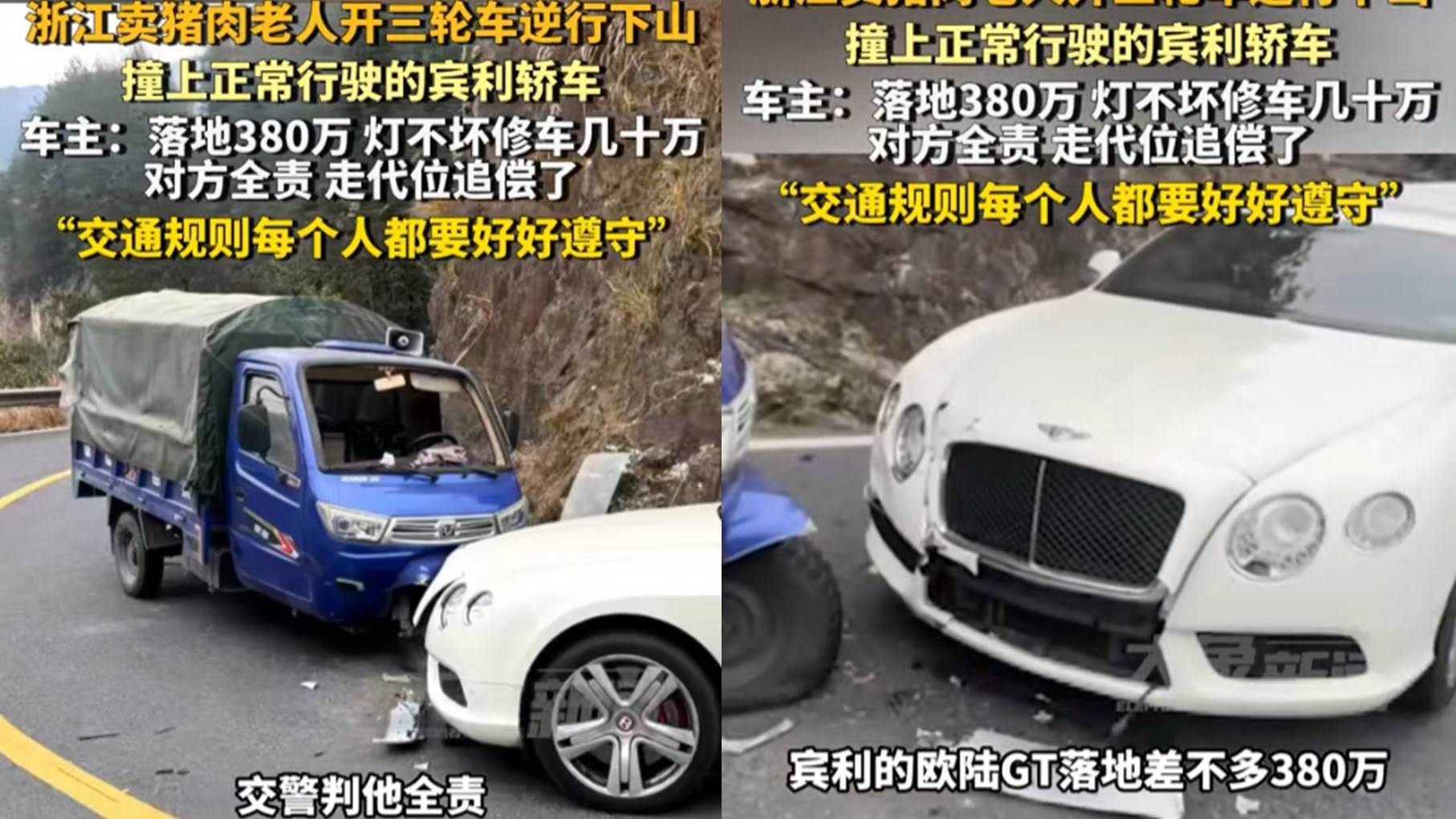 中國大陸浙江省衢州發生一起「貴桑桑」的車禍,一名阿伯開三輪車逆向撞上賓利轎車,車主表示該賠償的就該賠,新聞一出也引發網友熱議。