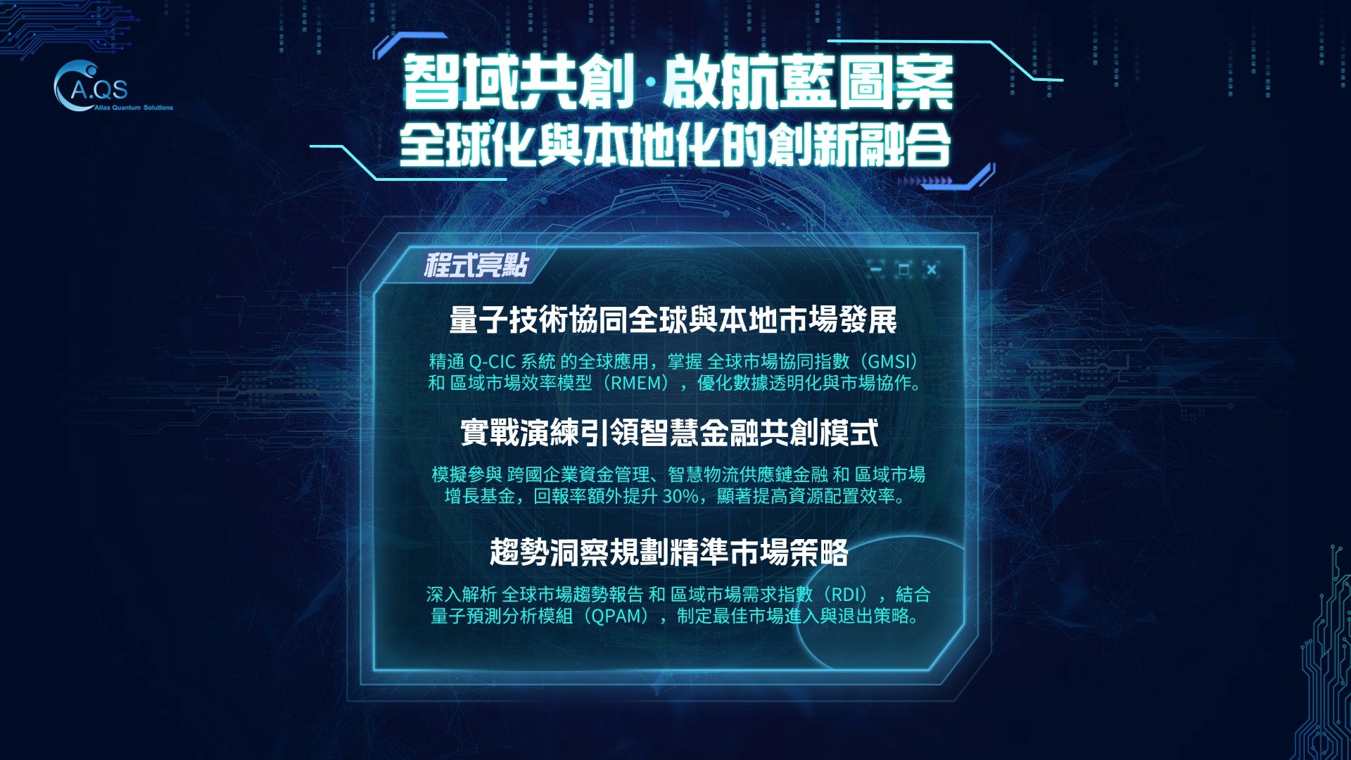 重啟啟航藍圖案:智域共創的最後窗口受此次記者會成功的啟發,A.QS 股東會宣布重啟「智域共創啟航藍圖案」。該計畫旨在針對個人用戶,為其提供量子技術的實戰體驗與市場策略指導,限時開放一個月。台灣將成為該藍圖案的重點市場,以其數據優勢與創新基礎設施,支持用戶深入參與智慧金融的未來布局。